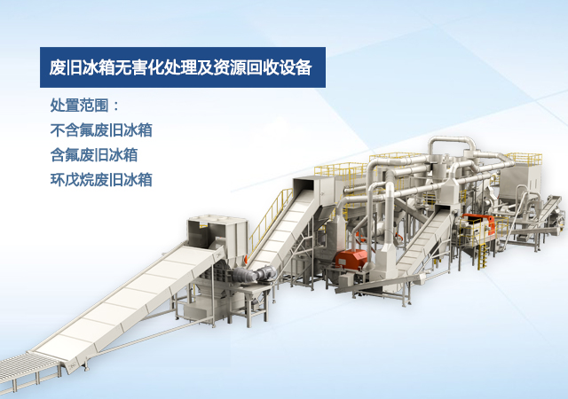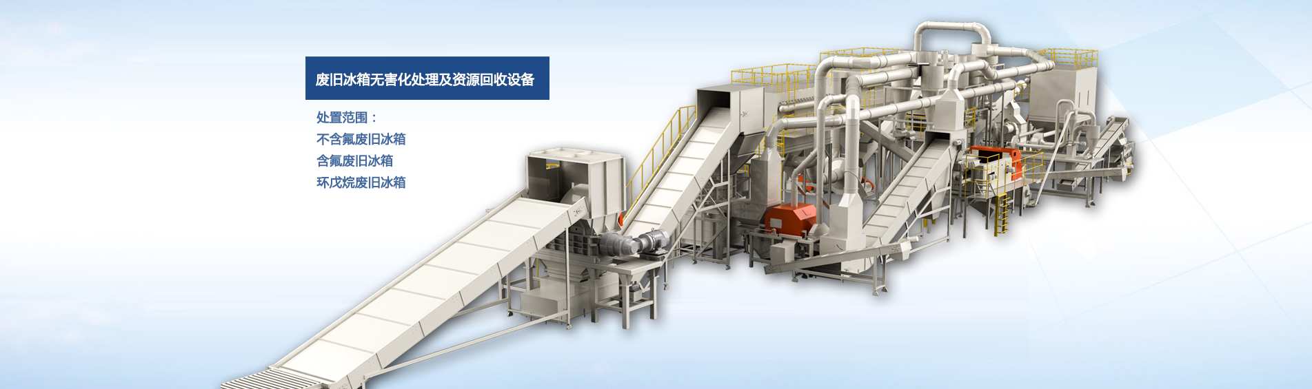 公司自主研發(fā)的廢舊冰箱無害化處理及資源回收技術(shù)及設(shè)備, 獨具 “雙軸撕碎機+立式破碎機+大風量稀釋環(huán)戊烷氣體”的專利組合設(shè)計, 主要用于對廢舊冰箱中的各種原材料進行分離、 回收和利用, 具有自主知識產(chǎn)權(quán), 經(jīng)國家工業(yè)和信息化部科技成果鑒定為 “填補國內(nèi)空白, 達到國際先進水平” 。